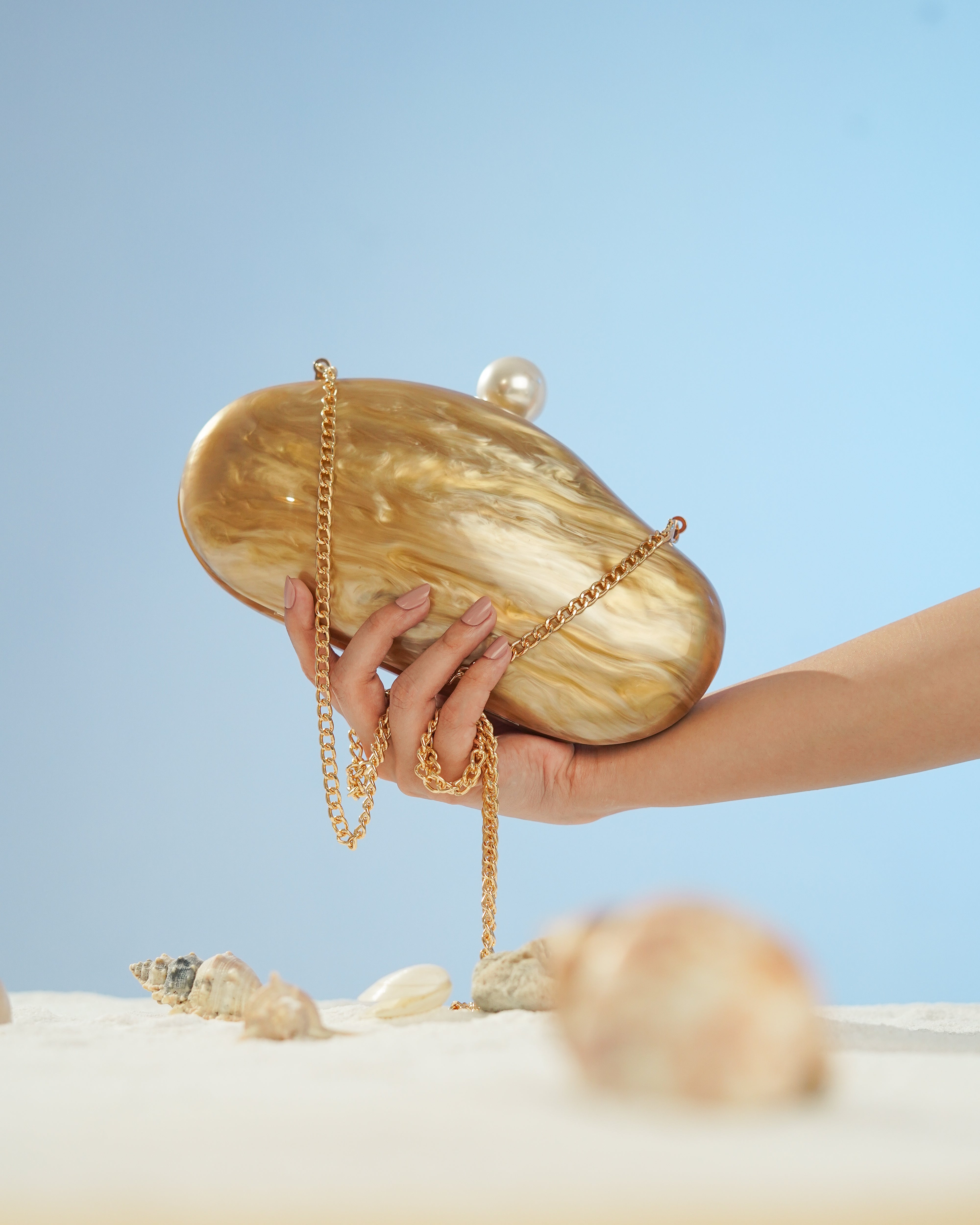 Inspired by the sunlit tones, Golden Dune reflects the richness of desert sands meeting the ocean shore. With its marbled golden-beige finish and pearl clasp, this clutch is the perfect statement of subtle glamour and natural beauty.